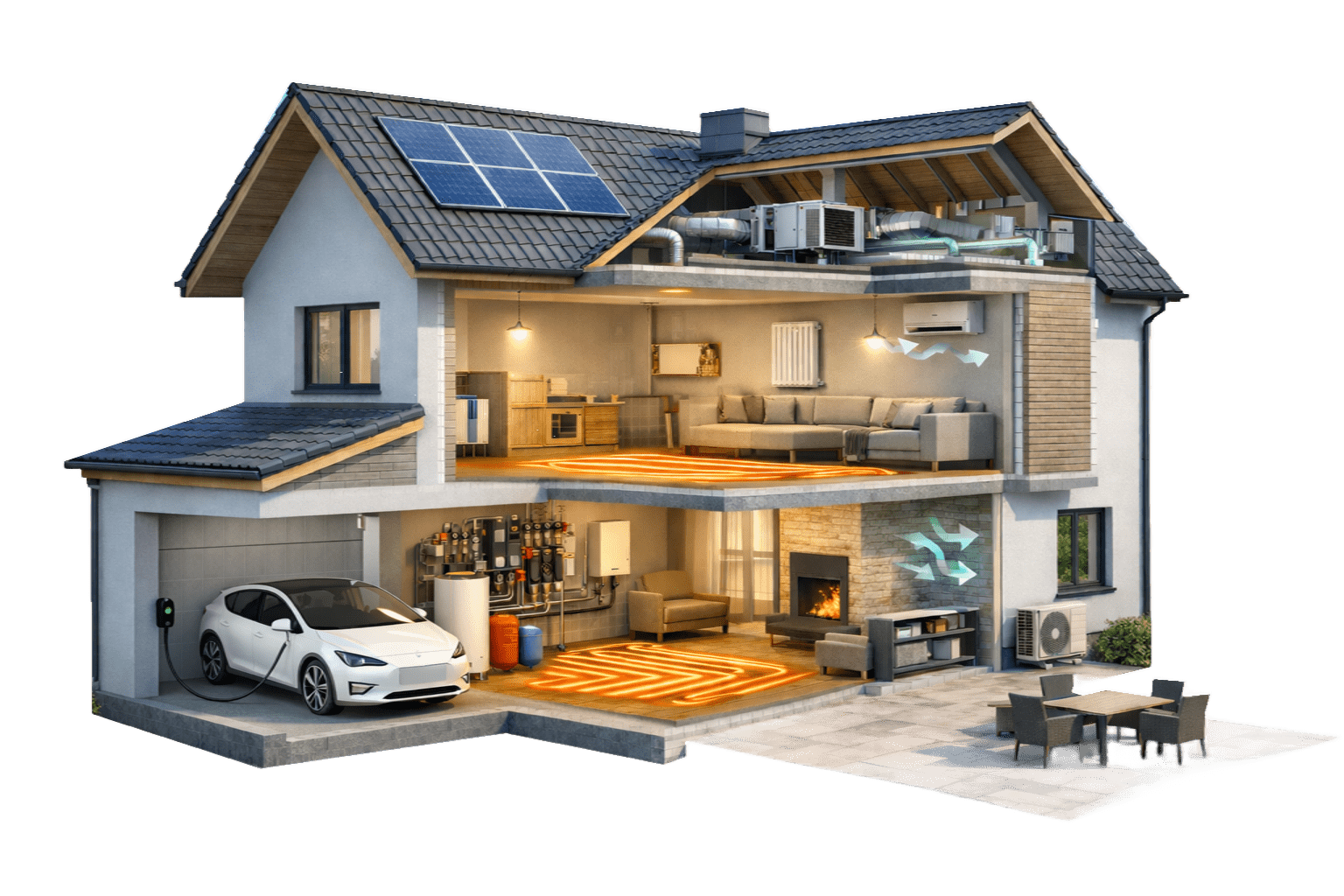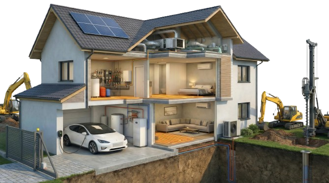 Kompleksowa instalacja pomp ciepła, które wykorzystują energię odnawialną z powietrza, gruntu lub wody do ogrzewania domu i wody użytkowej.